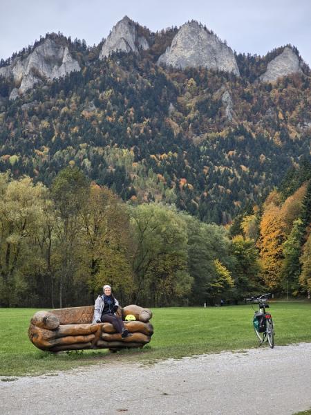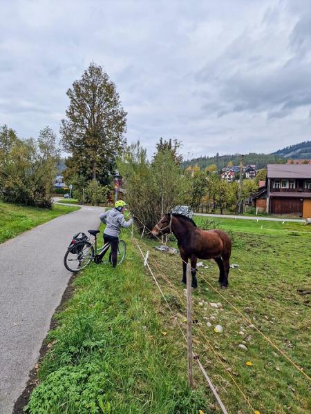The shuttle was waiting for us and Maciej took us to a small town called Chochołow. It has traditional wooden houses that make it a unique place to see. Then it was time for a stop. We took a break at a traditional log cabin restaurant. You can order a traditional baked cheese. I ordered a whole Goulash meal and felt like it was food for my soul. It was time to start the biking part but after the meal I had forgotten and was buckling for another ride in the shuttle. Lucky for me Maciej remind me. The path started through Chochołow and onto an excellent paved flat bike path that used to be a railroad track. The fields were small and many with sheep and cows grazing the pastures. The Tatra mountains were the kulise along our way. As we got close to the town of Nowy Targ, part of the path was newly built and is still gravel. We arrived at our hotel B&B Kat. A, rested first, and then had a small snack. The overall impression of Nowy Targ is that although it is a small town, there are many people young and old, many shops, that make it a dynamic city that looks to be economically thriving (I’m not an expert in this).