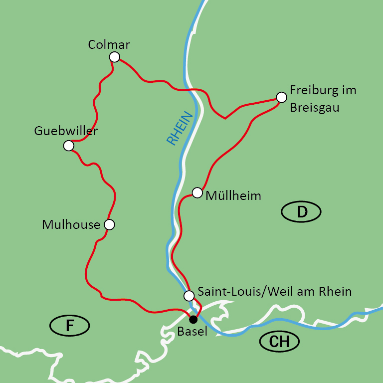 From Colmar we follow the French wine route. The dreamy wine-growing villages, with many Alsatian timber-frame houses, and magnificent mediaeval town centres in the midst of extensive vineyards are areas for unwinding, enjoyment and simply relaxing.