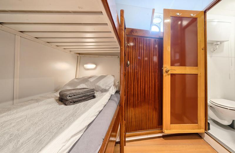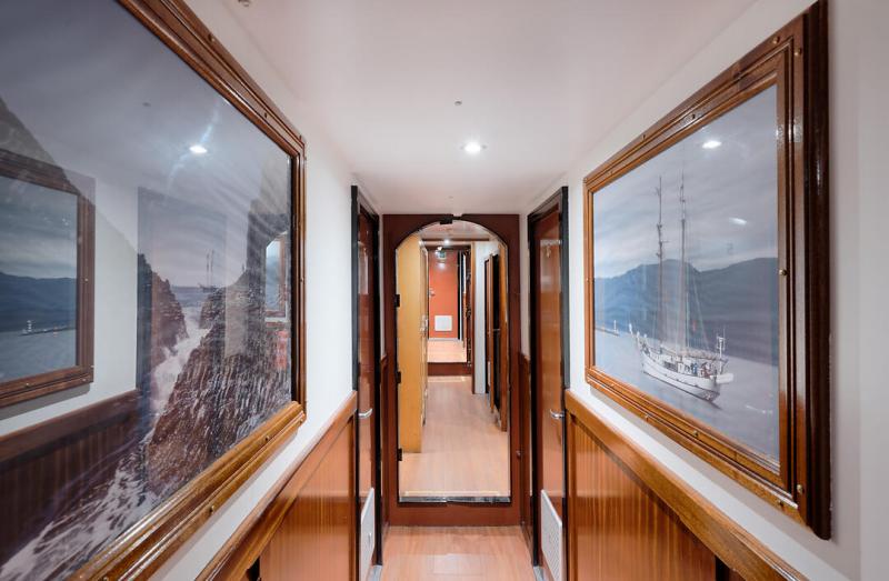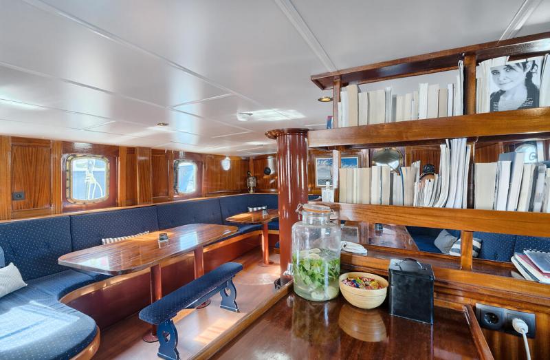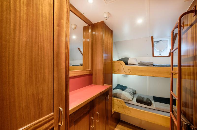 The ship has 10 small, but functionally furnished double cabins, each equipped with bunk beds, private shower and toilet. 1x cabin can be expanded to 3-4 bed cabin. 2-bed cabins for single use below deck possible. (subject to availability) The forward saloon in the deckhouse serves as a cozy dining and lounge area and offers seating for all guests on its cushioned benches