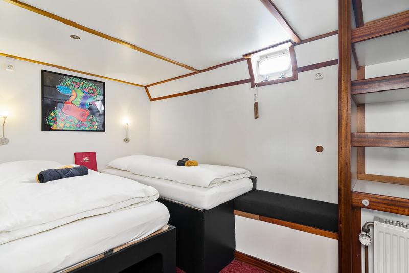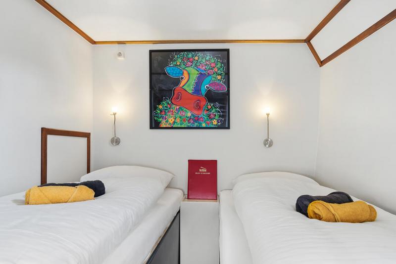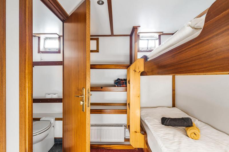 - 5x 2-bed-cabins with low beds, private facilities, central heating (comfort cabins 7m2)(2026: 2 superior cabins 10m²)