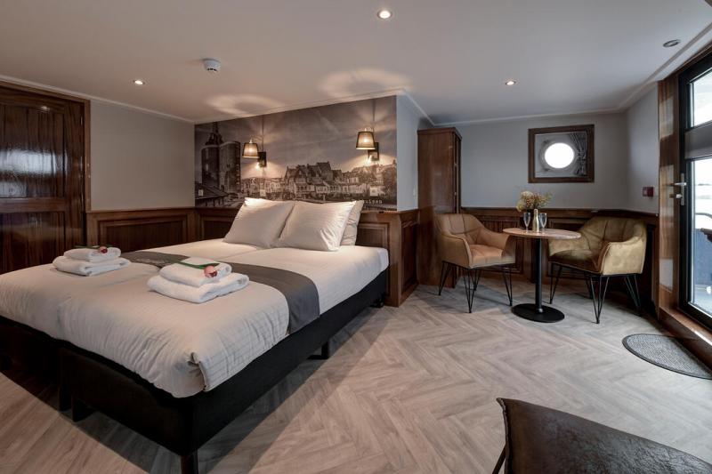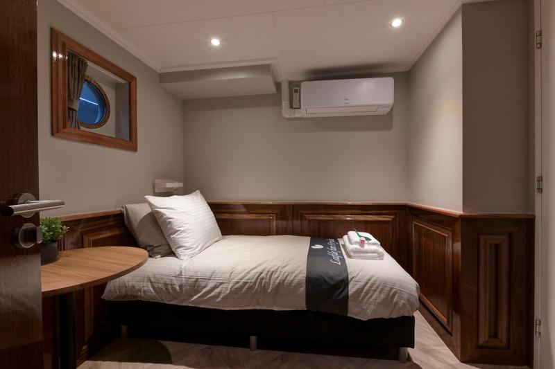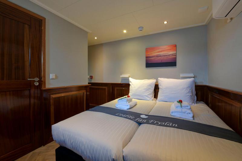 After rebuilding, the ship will have 13 twin cabins, two single cabins and one junior suite on the lower deck and four spacious new suites on the upper deck. All cabins have shower/toilet and a ventilation system, the 2-bed cabins are equipped with an additional pullman bed/folding bed for a 3rd person. The suites on the upper deck will be equipped with a glass door and a little balcony.