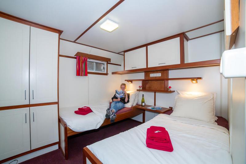 The Lena Maria has twelve spacious twin cabins (10,5 m² – 113 sq.ft.) with two separate beds. Each cabin has a private shower, toilet and basin. Windows can be opened and the cabins have ventilation and central heating. Furthermore, you will find a hair dryer in each cabin.