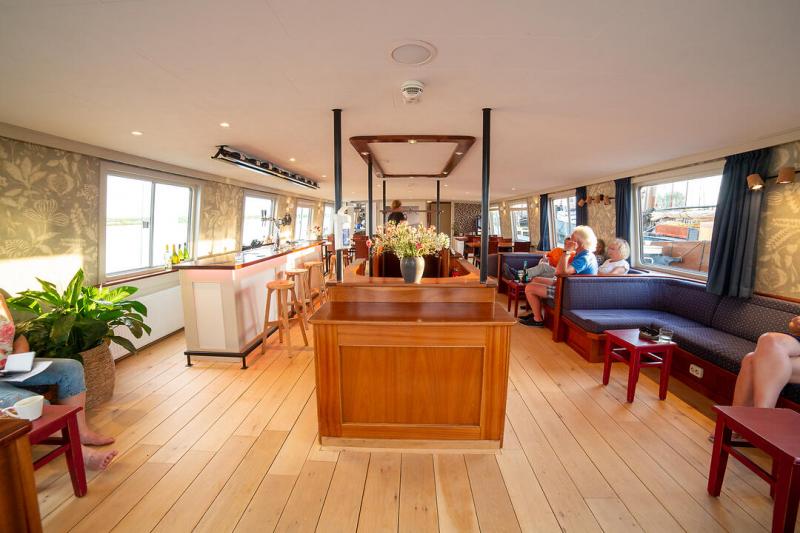 On the upper deck of the Lena Maria you will find the cozy lounge with the bar and dining area. Wi-Fi is available. The barge also has a beautiful sundeck, where you can have a drink. On nice evenings, or while cruising, you can enjoy the scenery from here.