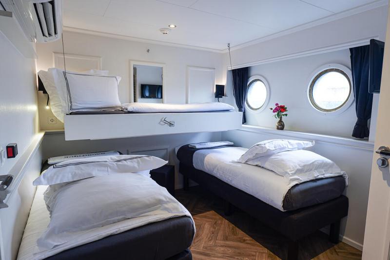 - Upper deck: 4 suites (approx. 14m²), 2 single beds (some can also be booked as double bed), small sitting area and large, openable panoramic window