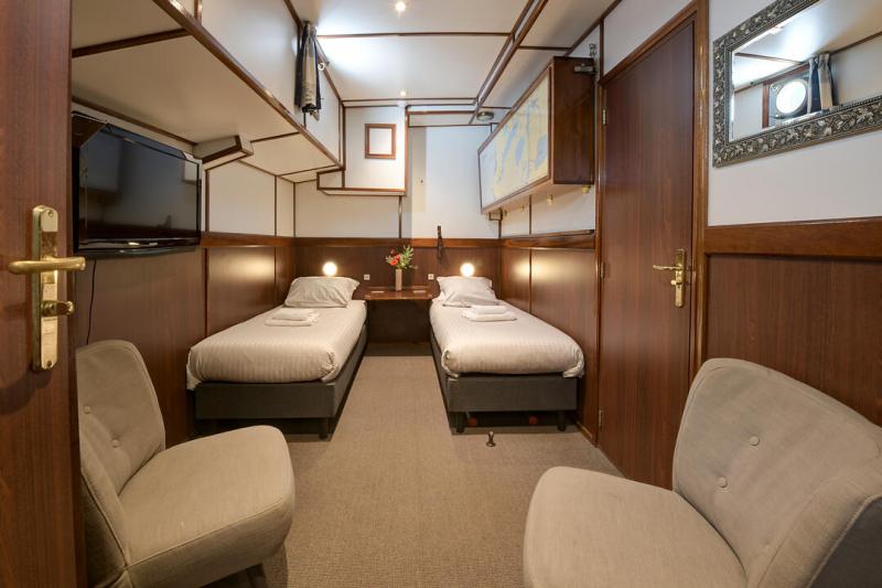 - 12 twin cabins (floor area of about 9 m² with two singel beds (90*200 cm) that can be put together