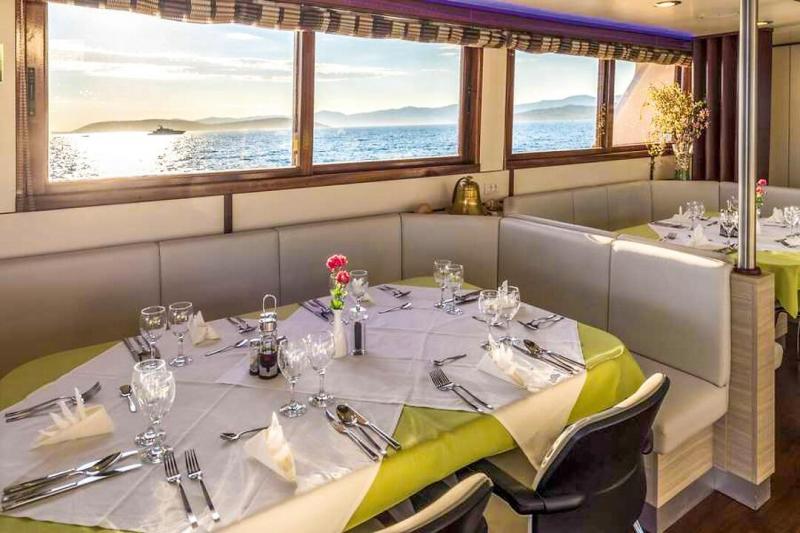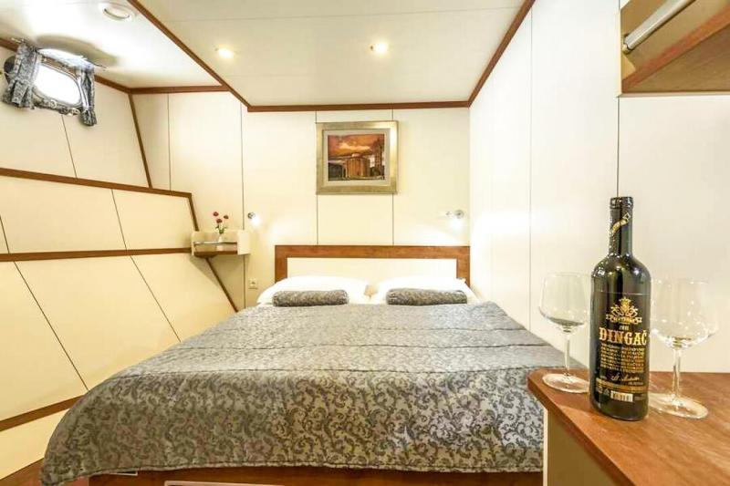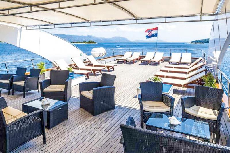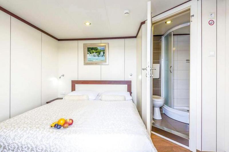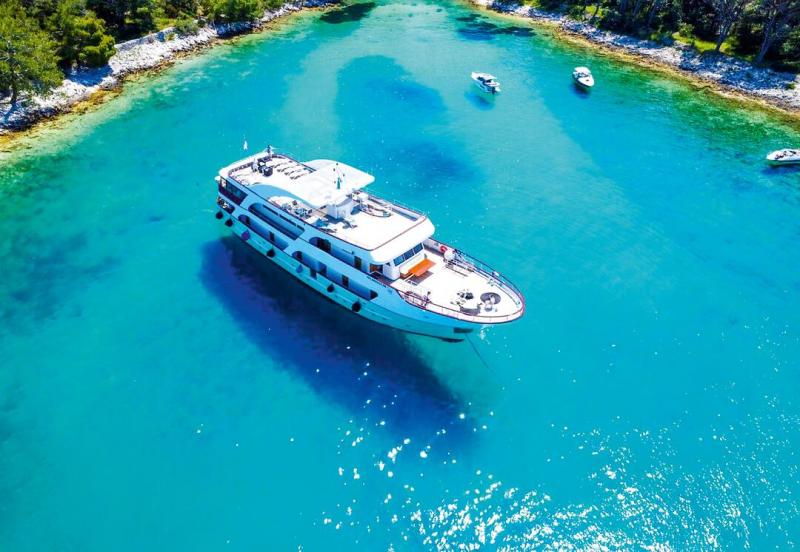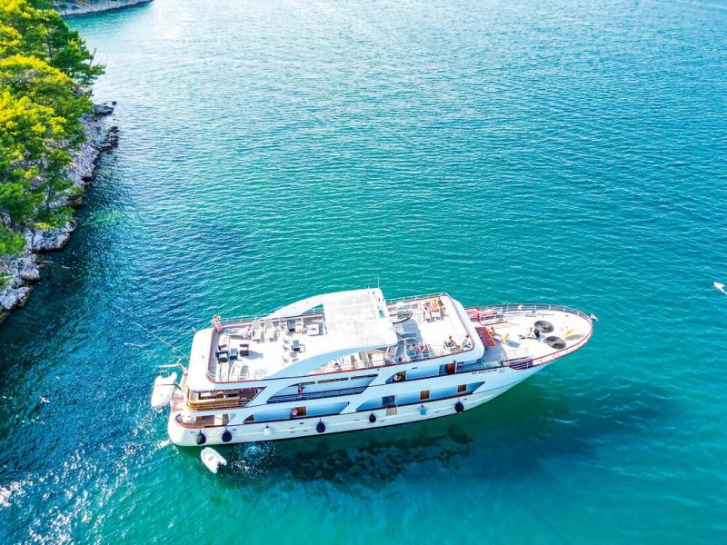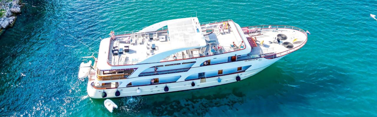 This charming coastal cruise ship, designed in the style of a yacht, allows you to discover the impressive Adriatic coast in comfort and style. The air-conditioned, modern cabins with en-suite bathrooms and high-quality amenities offer the ideal retreat for relaxing hours on board. The Olmissum features a panoramic restaurant, which can also be used as a cozy lounge or panoramic salon outside of mealtimes. An outdoor lounge at the stern invites you to relax. Those who prefer to enjoy the view from the bow can make themselves comfortable there and take in the passing coastal landscape.