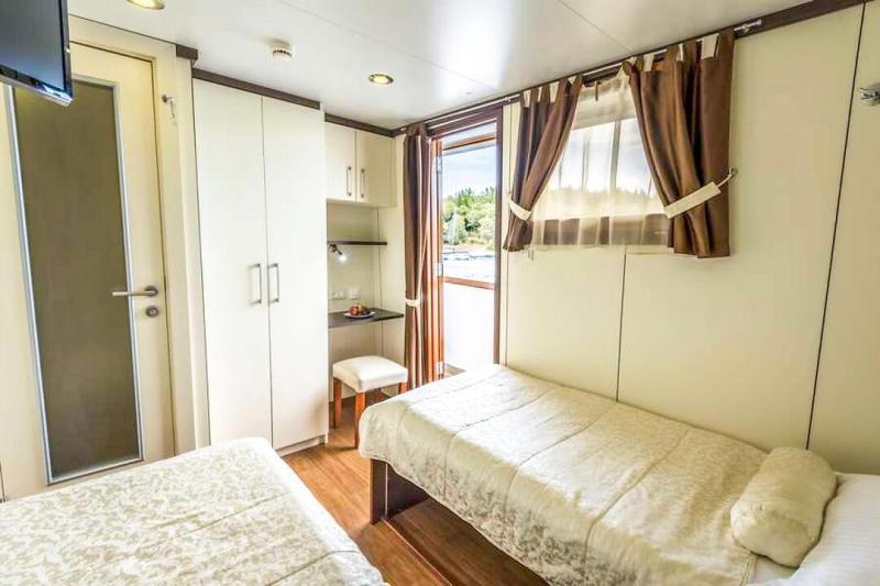 - Main deck: 6x double cabins with single beds, 2x double cabins with double beds, approx. 10m², windows that can be opened
