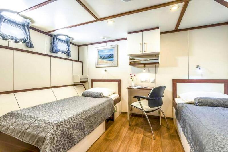 - Lower deck: 6x double cabins with single beds, 2x double cabins with double beds, approx. 11m², portholes that can be opened