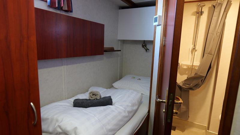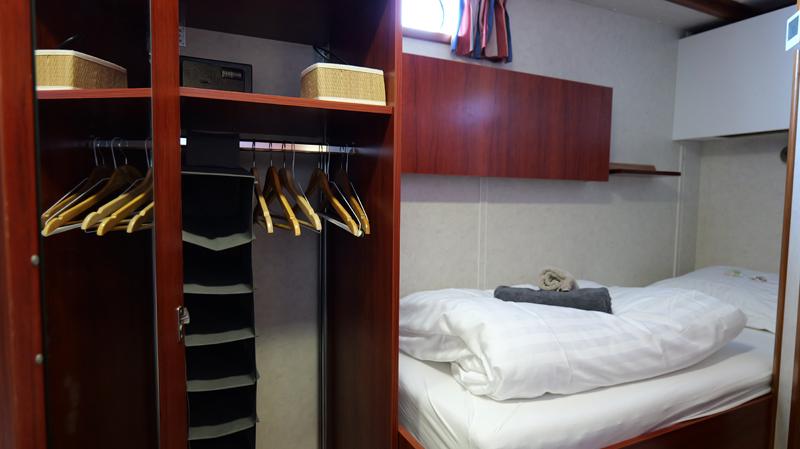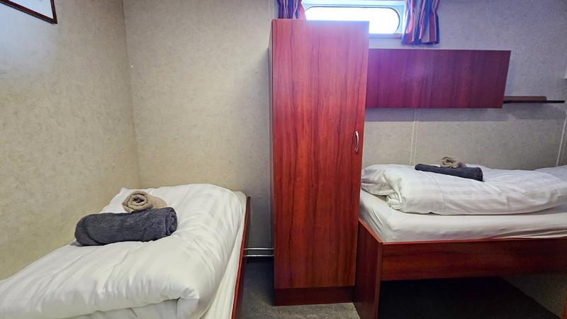 On lower deck the barge has 13 sleeping cabins: 10 twin cabins with two single beds each and two cabins with a double (French) bed and an additional 3rd bed as Pullman bed. The tour leader will be accommodated in a single cabin. All cabins have a small en-suite bathroom with toilet, shower and wash basin, a fixed window (both double cabins have larger windows that also open) and individual air conditioning.