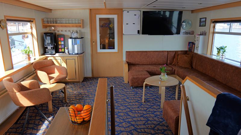 The Clair d’Etoile (formerly Zwaantje) is a unique and cozy Dutch passenger barge. On the main deck you will find the nice and cozy salon with air conditioning and large panoramic windows, a restaurant area, lounge corner and a small bar. Depending on the quality of the network connection (mobile internet, limited data amount) the salon offers free Wi-Fi. The barge has a very spacious sun deck (90m²) with chairs and tables and a beautiful view, where you can relax or join the skipper in the wheel house.