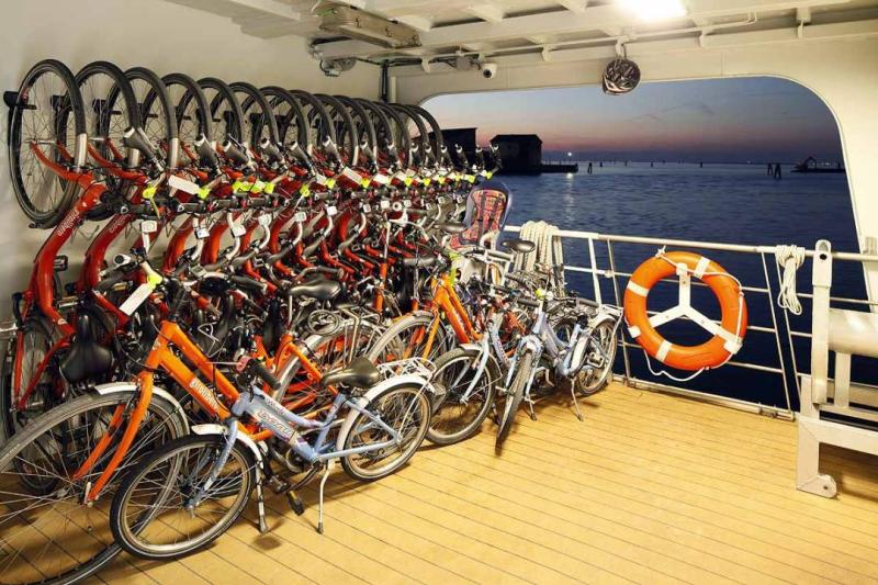 Bicycles are stored on a compact, vertical rack with a secure locking mechanism and are accessible to guests at all times. E-bikes can be charged here.