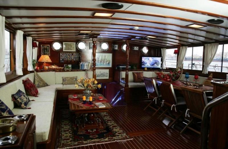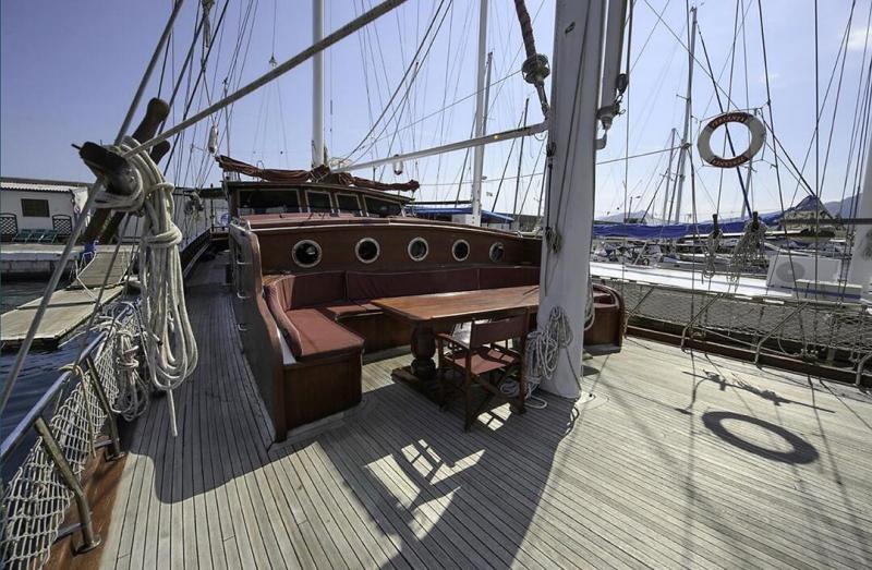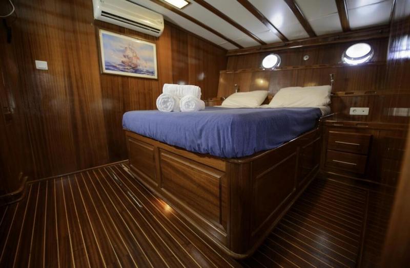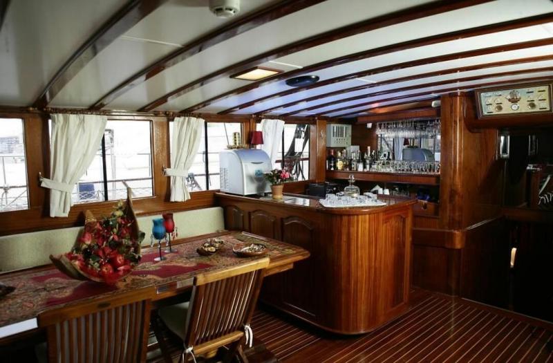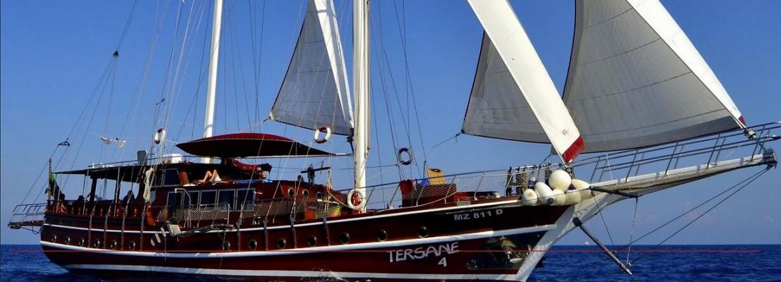The Tersane IV is a two-masted motor yacht built in the style of a traditional Turkish gulet. Upon entering the spacious and lovingly decorated saloon, you immediately feel welcome. This is where the crew serves their delicious specialties if the weather does not allow for dining on deck. Free Wi-Fi is available when the ship is in port. On deck, there are both shaded and sunny seating areas, as well as sun mats for relaxing. During swimming stops, guests can use the water sports equipment available on board.
