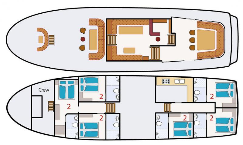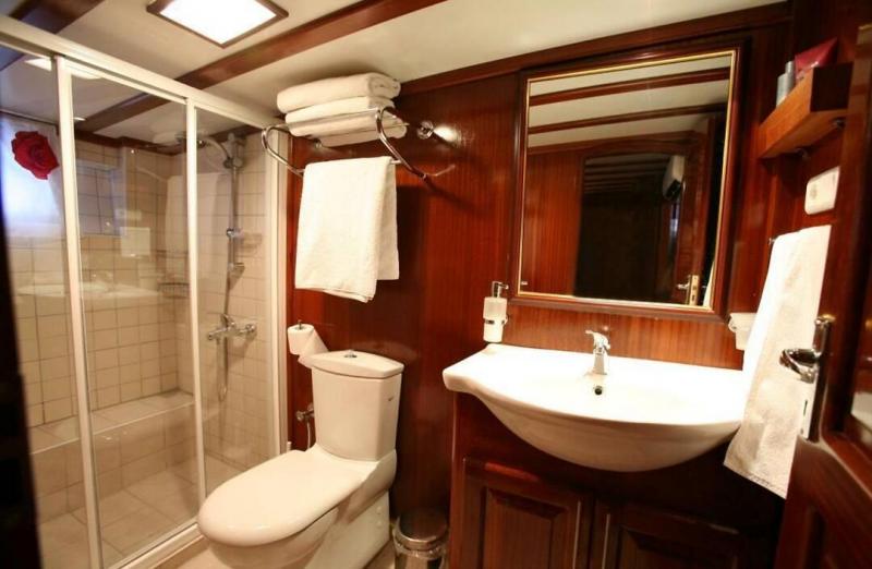 Below deck there are six comfortable double cabins (approx. 9 m²) with parquet flooring and beautiful wood furnishings. Each cabin has a double bed (approx. 185 x 160 cm), individually adjustable air conditioning, a TV, and its own bathroom with shower, sink, and toilet. The portholes can be opened to let in fresh sea air.